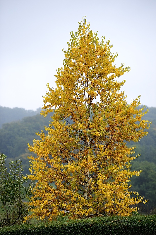 Ginkgos sind hier noch alle nahezu grün!Die Staphylea ist interessant, hier haben weder St. pinnata noch holocarpa nennenswerte Herbstfärbung.Gestern bei nebligem Wetter in der Nachbarschaft diese Birke. Erstaunlicherweise gibt's noch welche in Gärten, trotz des "Drecks", den die ja machen.