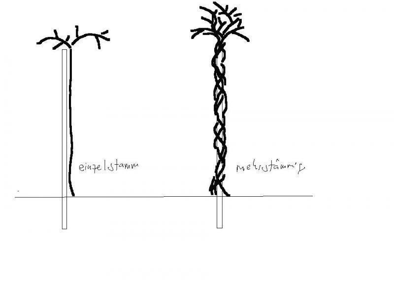ich hab zwei. ohne bild.am garteneingang je einen rechts und links vom hauptpfad.ich habe es vor ca. 5 jahren so gemacht:wetterfesten 3 meter langen pfahl 80 cm in den boden geknallt, blauregenpflänzchen drangepflanzt.die sich entwickelnden triebe angeheftet oben abgekappt. fertig.mit der zeit bildet sich oben eine krone, die man nach belieben zurückschneiden kann. sieht sehr schön aus. ich habe dann auch weitere bodentriebe hochwachsen lassen, die sich um den haupttrieb und den pfosten winden. in ein paar jahren wird der pfosten umschlossen sein und dann auch nicht mehr nötig sein.es sieht auch schön aus und macht wenig arbeit.