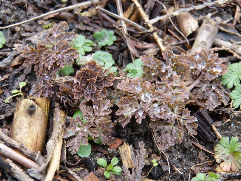 Corydalis ophiocarpa hatte sich nach dem langen Winter 2012/2013 still und leise verabschiedet, was mir erst ein paar Monate später aufgefallen war.(Nicht nach dem starken Wintereinbruch 2012, den hat er überlebt - ich habe Fotos aus dem Jahr.)In diesem Sommer zeigten sich die ersten zwei Sämlinge im Gemüsebeet - habe ich versehentlich zerhackt. :-\Und nun eine kräftige Rosette im Kartoffelbeet. Die Samen scheinen nicht ganz kurzlebig zu sein.