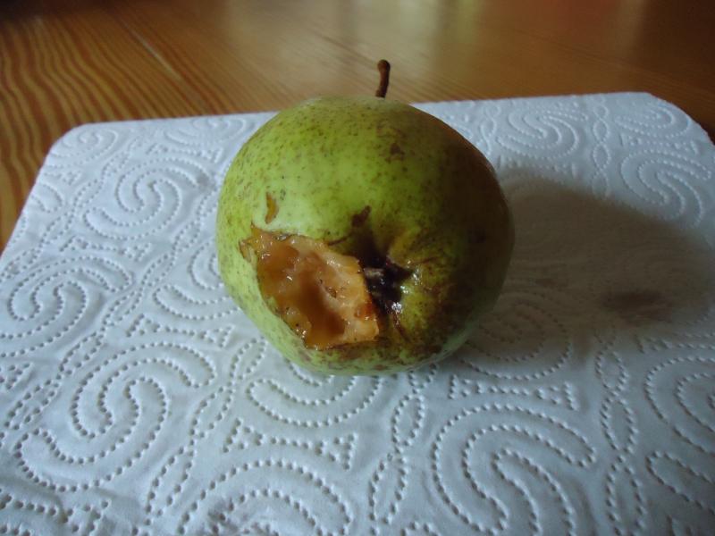 und hier die letzte einigermaßen unversehrte Birneca. 10 cm groß, auf der einen Seite grün, auf der anderen gelblich mit rötlicher Backe