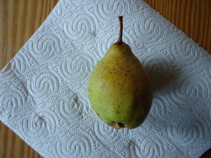 und hier die letzte einigermaßen unversehrte Birneca. 10 cm groß, auf der einen Seite grün, auf der anderen gelblich mit rötlicher Backe