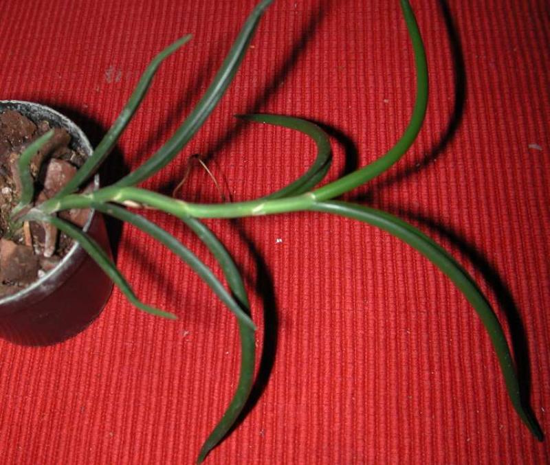 ... wird beträchtlich variert zu den Blättern mancher tereter Vanda-Arten mit ihrem runden Querschnitt, die auch das Blatt dieses Angraecum scottianum aufweist. Diese Pflanze wächst zudem noch leicht kriechend-kletternd und ist ebenfalls eine pflegeleichte Pflanze für eine kleine Vitrine im Zimmer (mit schöner weißer Blüte - Bild wird nachgereicht!