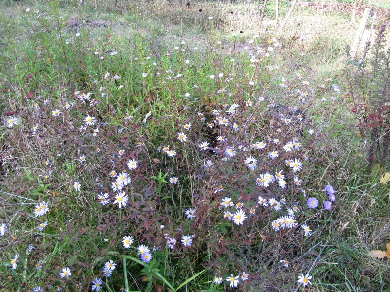 Der Rest von meinem Versuch, Astern in die Wiese zu pflanzen. Die horstig wachsenden wurden von den Wühlmäusen gnadenlos dezimiert. Die ausläufernden haben sich etabliert. Allerdings litten sie dieses Jahr sehr unter der Trockenheit. Ich gestehe, dass ich ein paarmal gewässert habe.
