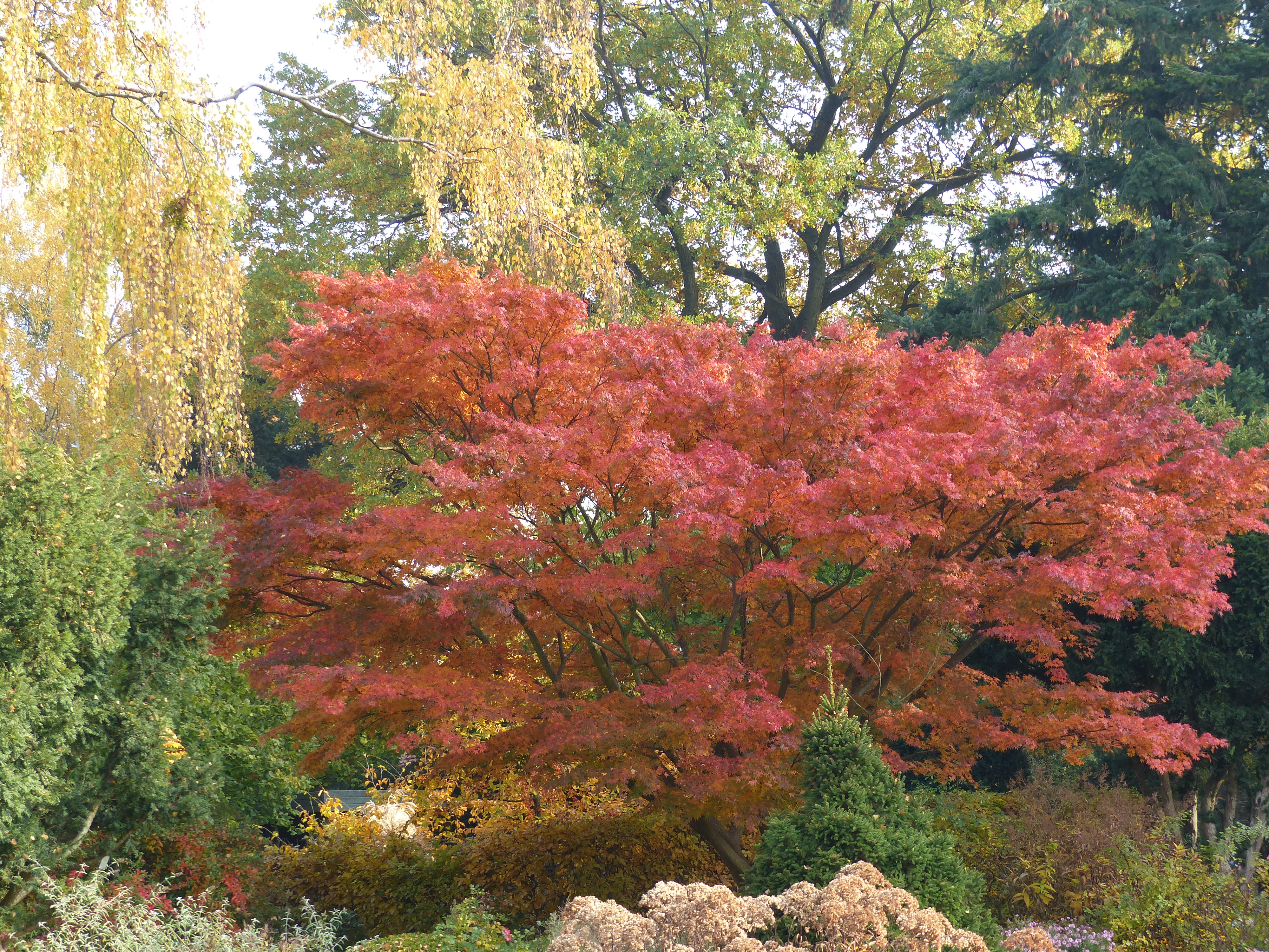 Da war jemand schneller, ich war gestern auch dort! Mal ein kleiner Ausflug für mich als lahme Ente. Aber einen Abstecher in die Gärtnerei war doch noch dabei.Am 27.10.2015 war ich mal wieder dort. Vieles ist verblüht, dafür bringt das bunte Laub Farbe in den Garten. Auch in dieser Jahreszeit - noch dazu bei Sonnenschein - ein prachtvoller Anblick! Für sich allein gestellt, würden manche der inzwischen vertrockneten Stauden unschön wirken; als Teil des Ensembles stimmt alles!Ein paar Bilder: