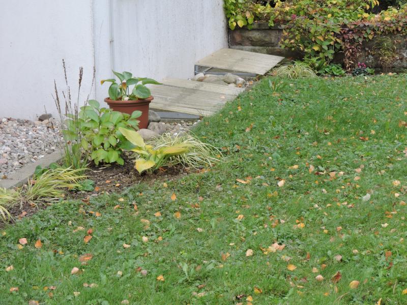 Nachdem ich in diesem Forum unzählige gekonnte Beete bestaunt habe (und manchmal gedacht habe, wie machen die Leut`das?) hoffe ich auf ein bisschen Beratung von eurer Seite.Ich bin in meinem Garten nun seit 7 Jahren dabei Pflanzen bewusster einzusetzen, meinen Garten kenn`ich allerdings schon 20 Jahre. Vom Süden über den Osten habe ich mich langsam vorgearbeitet und diesen Sommer das erste Mal gedacht, dass ich mal an den Nord/ Nordwesten ransollte, unbedingt, weil`s halt kein schöner Anblick war (und noch ist).Unschön ist und bleiben die Plastikdinger über den Oberlichtern; Schutz gegen Starkregen (wenn er denn mal wieder kommt), der in den Schächten nur langsam abfliesst. Also nicht zu ändern, aber den Blick könnte man ja vielleicht ein bisschen ablenken durch Vorgepflanztes, so meine Idee.An die schattigsten Stellen sind im Sommer, Herbst zwei Hortensien und noch ein bisschen was sonst eingezogen.Blick aus Entfernung über die ganze Länge, ist schon ziemlich kahl...