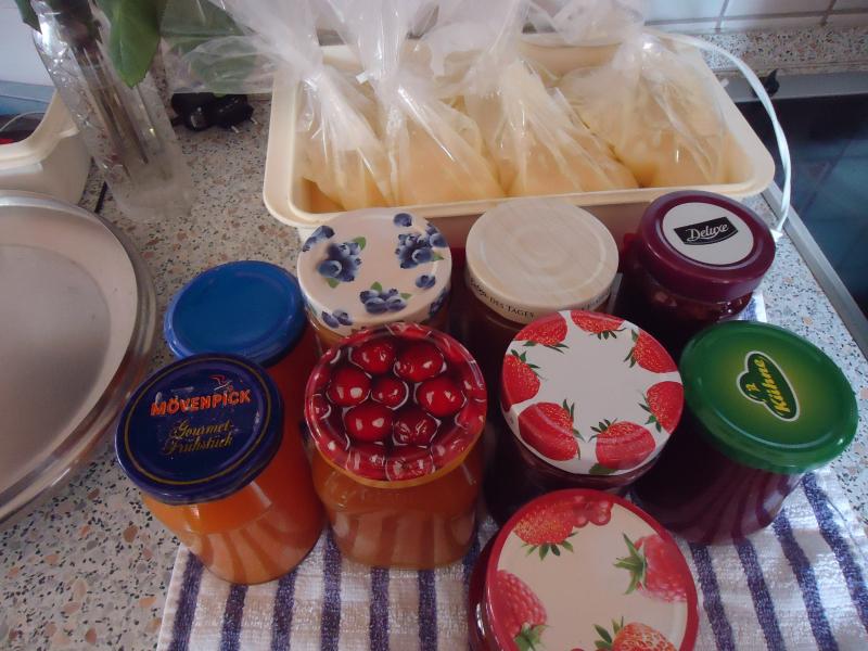 ich hab auch noch Apfelmus gekocht, Kürbis-Apfel-Marmelade und Erdbeermarmelade gemacht Der Apfelmus steht in Tüten in der Schale und ist schon in der Tiefkühltruhe