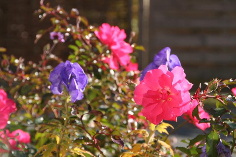 Hier blüht noch sehr eifrig die Rose Mirato, die im vergangenen regenarmen Sommer ohne Flecken auf den Blüten blieb mit Aconitum.