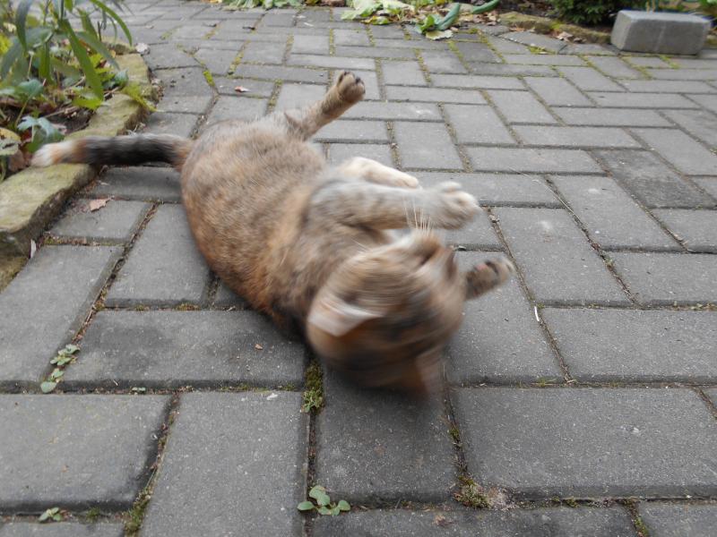 Ja. Sie rollt sich einem vor die Füße und war heute immer da.Sie scheint auch Zahnweh zu haben. :-[Vorne fehlt ihr einer der beiden Reißzähne.