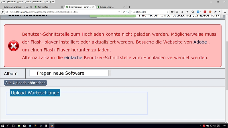 ja, teste du mal.Hier in diesem Forum? Wo? Ich glaube, nicht.Das Hochladen in ein Album geht nur Datei für Datei. ...... Es gibt, wenn man Dateien hoch laden möchte, die Option <mehrere Dateien - Flash-Unterstützung empfohlen>. ...