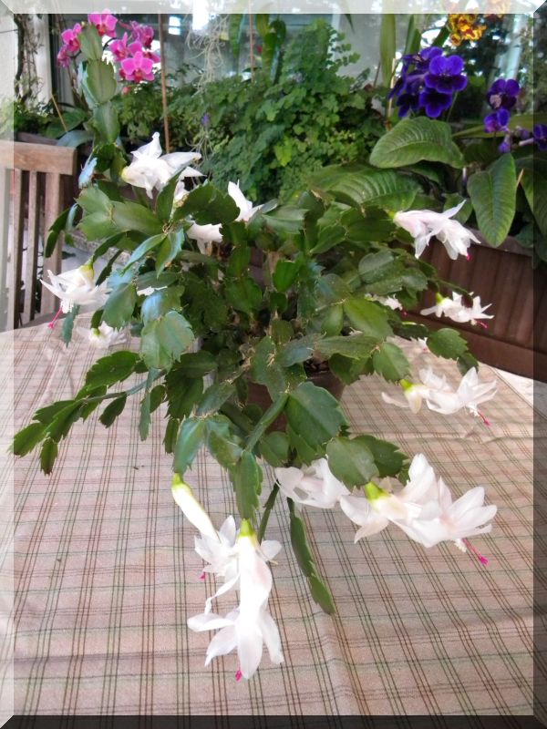 Die Schlumbergeras blühen auch eher schon im November - als Weihnachten.Weihnachtskaktus ist also nicht so ernst zu nehmen.Und noch einen Trick - obwohl ich nicht weiß, wie er den Pflanzen auf Dauer bekommt.Durch Trockenhalten für eine gewisse Zeit - und dann wieder gießen, kann man Schlumbergera - die ja übrigens früher Zygokaktus hießen - einige Male im Jahr zum Blühen bringen. Auch im Sommer. Es würde mir zwar widerstreben - aber praktisch geht es.Folgende Aufnahme stammt von einer blühenden Pflanze , welche im Juni aufgenommen wurde. Man sieht es auch an der Balkonbepflanzung.Da passe ich jetzt besser auf , dass sie durch zu häufiges Blühen nicht ihren Lebenswillen verliert..