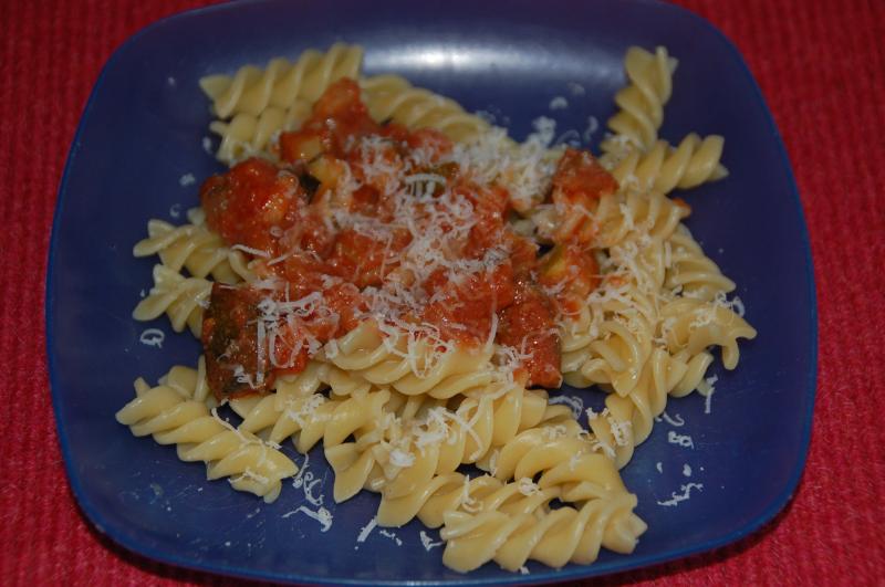 Spirellen mit fruchtiger Zucchini-Tomaten-Soße (Zucchini, Knobi, Zwiebel, pass Tomaten, Quittenmus).