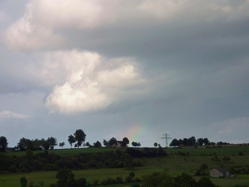 das "regenbogenfragment" auf meinen bildern fand ich schon sehr ungewöhnlich. allein die zeitdauer: zwischen der ersten aufnahme und der letzten liegen fast 3 stunden. hab noch nie einen regenbogen gesehen, der so lange dauert. und das fragment war schon da, als die wolke noch übers haus zog. wenn dann irgendwelcher niederschlag gekommen ist, so hat er den boden nicht erreicht. die wolke bewegte sich äusserst träge, lediglich der schirm drumrum wurde immer breiter. und unter diesem schirm war die lichtreflexion die ganze zeit an derselben stelle bis kurz vor sonnenuntergang.loni, dein roter regenbogen hat doch rechts und links auch noch reflektionen.