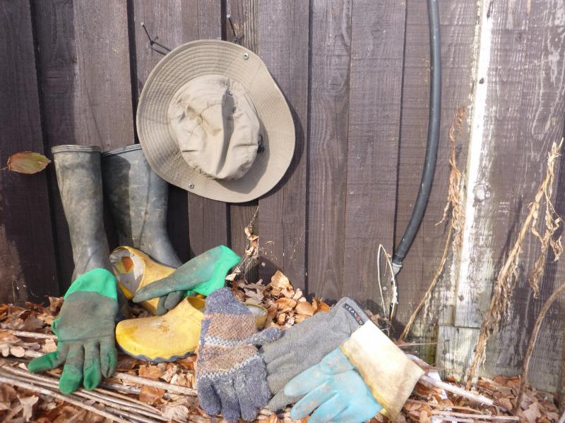 Ausgedient für die nächsten MonateMit Gartenhandschuhen könnte ich auch ein Stillleben schaffen, aber vor allem mit linken, die rechten haben fast alle ein Loch am der Mittelfingerspitze