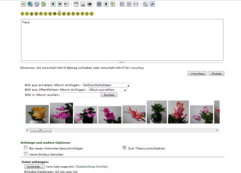 Jetzt möchte ich das Einstellen mehrerer Vorschaubilder in einem einzigen Beitrag, die sich dann beim Anklicken vergrößern, noch einmal üben. Im Beitrag von zwerggarten vom 28.10., 9.34 Uhr, kann man sehen, wie ich die Bilder einstellen möchte. Damit Ihr erkennen könnt, welchen grundsätzlichen Fehler ich mache, zeige ich nun schrittweise auf, wie ich vorgehe: 1.) „Bild aus privatem Album“: Hier wähle ich als Beispiel meinen Ordner „Weihnachtskakteen“.2.) Dann klicke ich darunter auf „Suchen“3.) Es erscheinen die kleinen Vorschaubilder. (siehe angehängtes Bild ganz unten)4.) Rechtsklick auf das erste Bild (gelbe Blüte), Linksklick auf „Grafikadresse kopieren“, Curser in Antwortfeld setzen, Linksklick auf „Bild einfügen“, Grafikadresse in die erscheinende Maske einfügen, auf OK klicken.5.) Dann bekomme ich das kleine Vorschaubild. Leider lässt sich dieses aber durch Anklicken nicht weiter vergrößern.