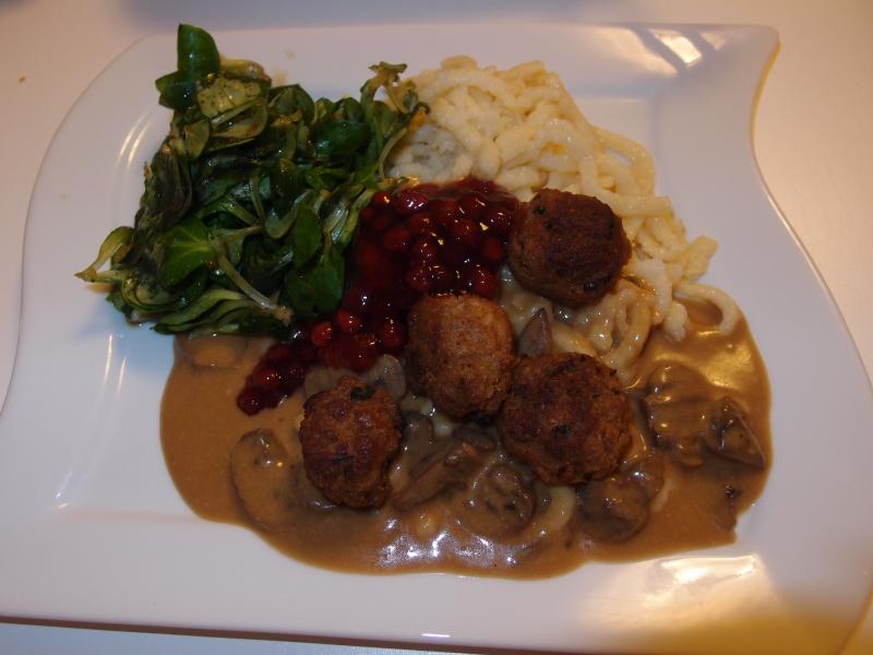 und montag minifleischküchle mit spätzle, pilzrahmsoße, ackersalat und preiselbeeren