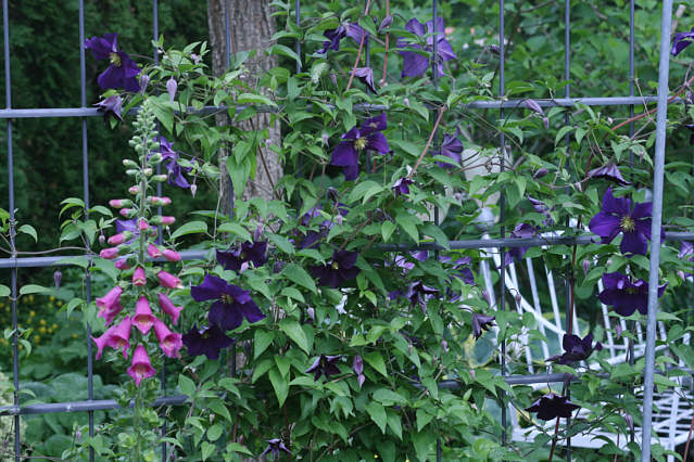 Hallo !Die erste Cl.vit ist die Viola, die die Super Dorothy total zugewuchert hat. Ich pflanze nur noch integrifolias zu Kletterrosen. Jetzt steht die Viola an einem ganz breiten Gerüst, da kann sie sich austoben