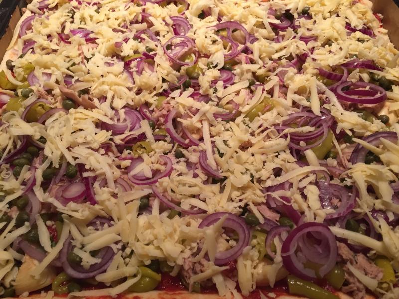 pizza mit artischocken, milden peperoncini, thunfisch, kapern, roter zwiebel