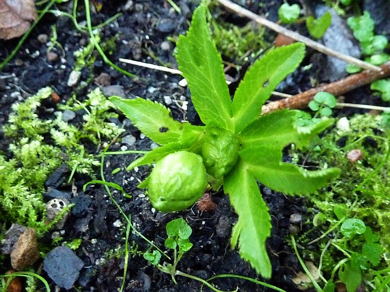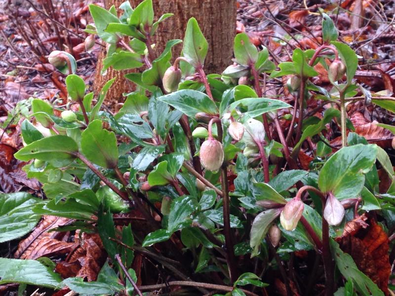 Helleborus purpurascens ist hier auch schon recht weit und es sind schon Knospen zu sehen, was sonst erst Ende Januar der Fall ist.