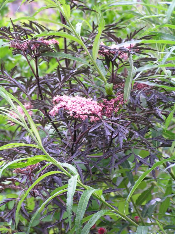 Hier sieht man links vom Holunder den Hibiscus um den es mir geht. Das Bild ist aber schon älter.Der Hibiscus ist gerade mal zaghaft am Austreiben, während der Holunder schon schön dicht macht.