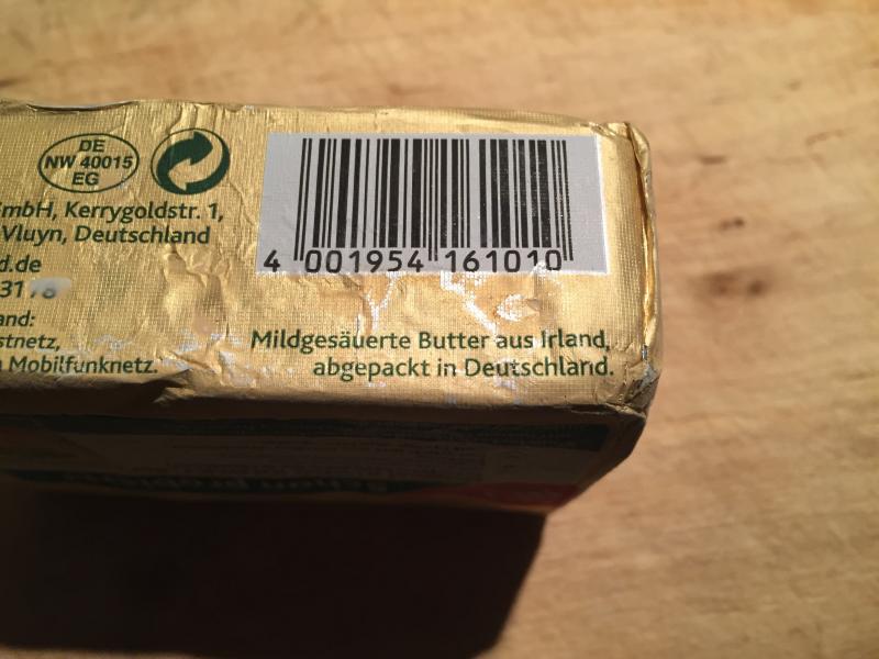 ich auch: "mildgesäuerte butter aus irland, abgepackt in deutschland. (an anderer stelle:) 82% fett"... Ich habe mal auf der irischen Verpackung nachgesehen: "Aus original irischer Butter & wertvollem Rapsöl". ...