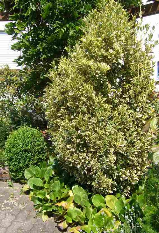 Eher Aureomarginatus, bin mir aber nicht sicher.Er steht jedenfalls aus eigener Kraft.Andere Sorten kann man mit einem Gerüst auch schmal als eine Art Hecke ziehen.Im Vorgarten habe ich das mit E. fortunai 'Blondy' vor der Hauswand gemacht.Dort ist es allerdings recht geschützt.Mit den kleinblättrigen Sorten geht das auch.Ich tippe hier auf Euonymus japonicus 'Aureomarginatus' oder 'Americanus'.Leider relativ frostempfindlich.Von dem Euonymus habe ich jetzt auch nur ein Bild von 2013 gefunden.