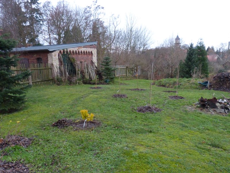 Bei Kohout habe ich nun noch Pinus mugo 'Zundel' bestellt, da die 'Chief Josef' mit ihrer markanten Farbe doch recht einsam im Birkenhain steht, da braucht es ein Gegengewicht. Ein paar Bilder von heute - wenn auch wohl nicht allzu viel darauf zu erkennen ist. Drei Cornus 'Midwinter Fire' habe ich heute auch noch an den Hain gepflanzt.