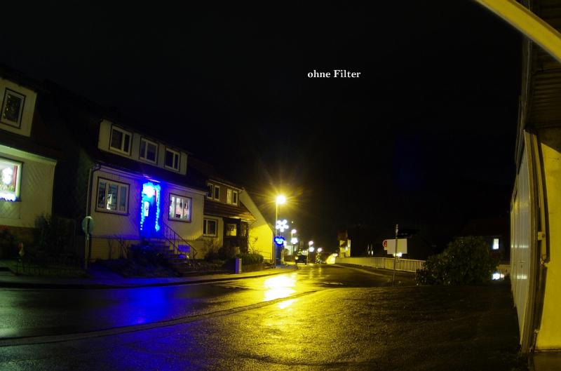 Heute ist mein neuer Filter angekommen. Es gibt von Hoya einen Filter , der als Nebeneffekt zu seiner eigentlichen Aufgabe genau die Wellenlänge von Natrium- und Quecksilberdampflampen herausfiltert, die uns bei Nachtaufnahmen so stören.Es handelt sich um den Hoya Redhancer (Didymfilter) Ursprünglich ist der Filter zum intensivieren von rot- und Grüntönen bei der analogen Fotografie gedacht gewesen.Es war etwas schwierig, ihn zu bekommen, da er in der EU nicht mehr hergestellt werden darf. Aber, es sind noch Restbestände erhältlich. Eine Liste und die dazugehörige Diskussion habe ich hier verlinkt.An meiner K5 habe ich das beste Ergebnis mit der WeißabgleichsEinstellung "Glühlampenlicht" erzielt.Da ich mein privates Album nicht wiederfinde (die neuen Buttons sind nicht der Hit) muß ich einzeln hochladen: