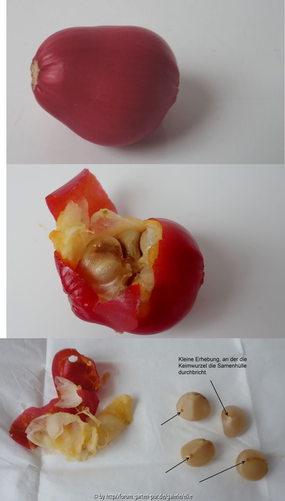 Wenn die Beere rot aussieht ist sie reif. Zum Anderen kann man so lange warten bis sich die ersten bräunlichen Stellen zeigen und die Beere weich wird. Dann ist sie überreif.Das Risiko dabei ist, daß in dem Fall bereits Samen in der Beere gekeimt sein können und sie sehr leicht beim Auspulen abbrechen. Da muß man dann sehr vorsichtig zu Werke gehen.Die von mir vorzeitig abgebrochene Beere war noch grün. Wie eindeutig zu sehen ist, sind die Samen trotzdem gekeimt. Es ist also davon auszugehen, daß die Samen gefärbter Beeren keimen.