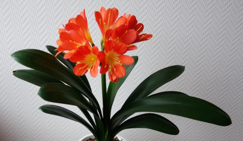 Beim Umtopfen einer sehr kompakt wachsenden Klivie ist mir vor zwei Jahren ein winziges Kindel abgebrochen. Dieses habe ich dann in einen kleinen Topf gesetzt. Es hat brav Wurzeln und Blätter gebildet. Da es im Herbst noch zu wenige Blätter hatte, habe ich es im warmen Zimmer zusammen mit allen kleineren Sämlingen gepflegt. Unerwartet hat dieses Kindel nun doch schon einen Blütentrieb entwickelt. Und da die Temperaturen in den letzten Wochen und ebenfalls jetzt noch hier am Niederrhein wegen der sehr milden Wetterlage auch nachts am Fenster nie unter 18 °C gefallen sind, entwickeln sich die Blüten schon tief unten zwischen den Blättern. Diese Temperatur ist für eine Verlängerung des Blütenstandes zu hoch.