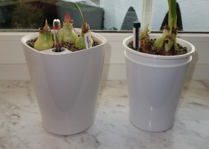 Nun das Original und der Nachbau im bepflanzten Zustand. Ich habe Zwiebeln von Hippeastrum multiflore genommen, die sich sehr flott vermehren.Der Deltini von Lechuza ist eindeutig eleganter, aber auch erheblich teurer (16,50 Euro inklusive Innenteil, Wasserstandsanzeiger und Pon). Mein Eigenbau hat ca. 6,-- Euro gekostet. Wasserreservoir: Deltini 0,2 l, Eigenbau: 0,25 lViele GrüßeElke