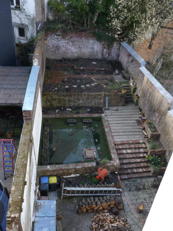 Unter dem Teich ist der Keller des abgerissenen Hinterhauses, mit Bauschutt verfüllt.