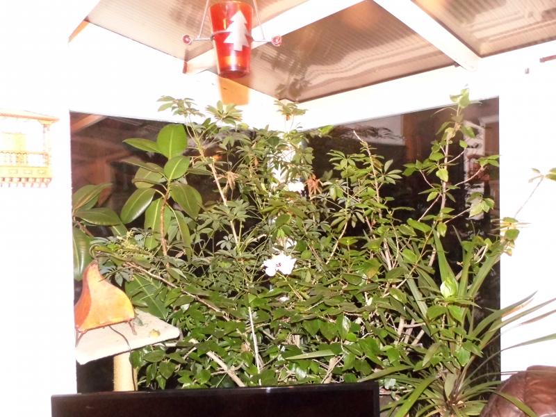 Schlechtes Bild, noch mal die Ecke mit meinen Großen:Da stehen Gummibaum, Schefflera, zwei Hibisküsse, eine Yucca o.ä.rechts - aber man sieht noch gut, dass die Schefflera beliebte zu blühen und alles eingesaut hat...den großen Elefantenfuß erspare ich euch, er sieht eben aus wie ein Elefantenfuß