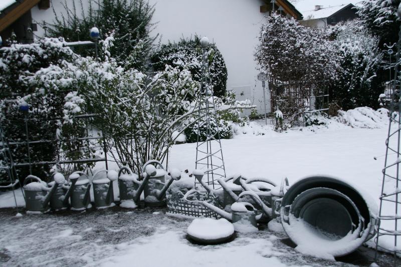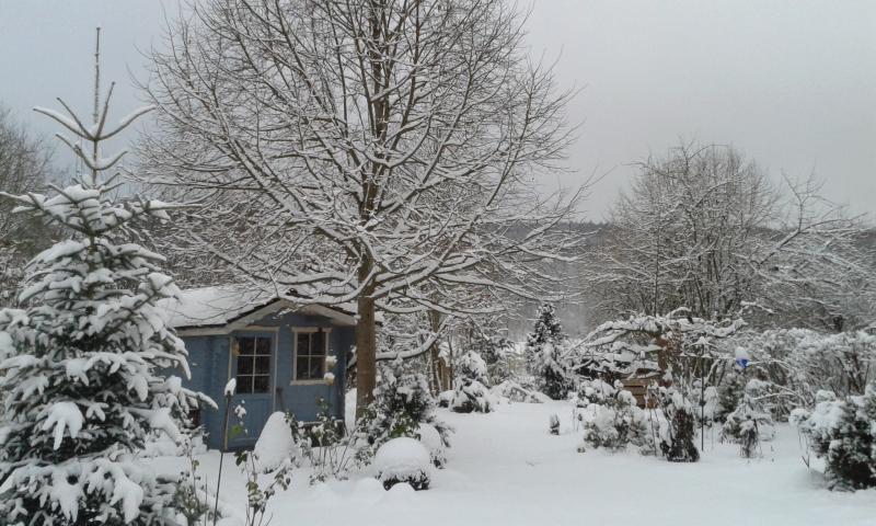 Die Landschaft ist dick verschneit. Im Garten sind 20cm gemessen :DTakt -1, 5ºC bei leichtem Schneegrieseln