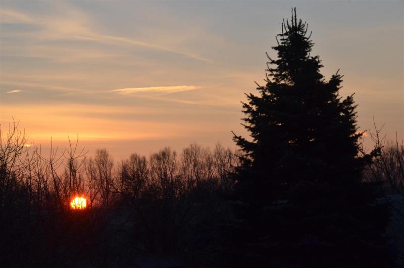 Hier kommt sie um 9 über den BergKein Fitzelchen Schnee und mit -7.5° ist es auch hier etwas kälter als zuletzt vorhergesagt. Ausserdem sausst die Temperatur selten so plötzlich so tief... hoffentlich reichen die Abdeckungen. Aber lange soll's ja nicht gehen.In ca. einer Viertelstunde wird die Sonne am glasklaren Himmel aufgehen.