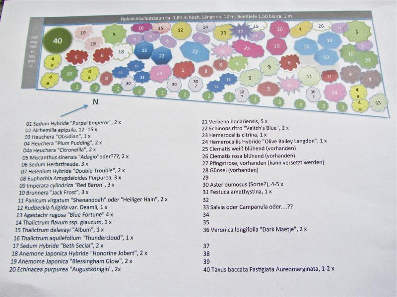 Guten Morgen,ich bitte um Beratung für die Bepflanzung eines neue anzulegenden Beetes entlang der Grundstücksgrenze vor einem dunklen, dichten Sichtschutzzaun. Das Beet ist ca. 12 m lang und an der breitesten Stelle etwa 1,60 tief. Es läuft gleichmäßig bis auf ca. 1 m Tiefe aus.Am rechten Ende ist ein schmaler Plattenweg vor der Rückseite einer Doppelgarage mit weißem Anstrich. Am linken, schmalen Ende befindet sich ein kleiner um zwei Treppenstufen vertiefter Sitzplatz in der Süd-West-Ecke des Grundstücks.Das Beet liegt teils vollsonnig, teils halbschattig. Der Boden ist neutraler, gut durchlässiger Gartenboden mit vielen kleinen und größeren Steinen (Faulschiefer) durchsetzt. Bisher sind dort Gras und ein paar Herbsthimbeeren gewachsen.Ich habe versucht einen Pflanzplan zu entwerfen und hätte gern Euren Rat hinsichtlich der vorgesehenen Pflanzen: Gibt es Bedenken gegen bestimmte Pflanzen, passen die Gräser dazu etc. Ich habe die Pflanzen nur unter dem Aspekt „gefällt mir/hätte ich dort gern“ ausgesucht.Ist die Anzahl sinnvoll? Wäre im Hingtergrund noch Platz für Kandelaber-Ehrenpreis? Insgesamt kommt es mir auf dem Plan noch sehr chaotisch vor. Auf welche Pflanzen sollte ich lieber verzichten?Ich bin sehr gespannt auf Eure Kritik/Vorschläge und sage schon mal „Vielen Dank“. HostalilliP.S.: Leider gelingt es mir nicht, meinen mühsam erstellten PowerPoint-Plan anzuhängen weil der Dateityp nicht erlaubt ist. Vielleicht könnt ihr ja aufgrund meiner Pflanzenliste etwas dazu sagen. Das Beet hat eine Süd-West-Ausrichtung.01 Sedum Hybride "Purpel Emperor", 2 x02 Alchemilla epipsila, 12 -15 x03 Heuchera "Obsidian", 1 x04 Heuchera "Plum Pudding", 2 x04a Heuchera "Citronellla", 2 x05 Miscanthus sinensis "Adagio"oder???, 2 x06 Sedum Herbstfreude. 3 x 07 Helenium Hybride "Double Trouble", 2 x08 Euphorbia Amygdaloides Purpurea, 3 x09 Imperata cylindrica "Red Baron", 3 x10 Brunnera "Jack Frost", 3 x11 Panicum virgatum "Shenandoah" oder "Heiliger Hain", 2 x12 Rudbeckia fulgida var. Deamii, 1 x13 Agastachr rugosa "Blue Fortune" 4 x14 Thalictrum flavum ssp. glaucum, 1 x15 Thalictrum delavayi "Album", 1 x16 Thalictrum aquilefolium "Thundercloud", 1 x17 Sedum Hybride "Beth Secial", 2 x18 Anemone Japonica Hybride "Honorine Jobert", 2 x19 Anemome Japonica "Blessingham Glow", 2 x21 Verbena bonariensis, 5 x22 Echinops ritro "Veitch's Blue", 2 x23 Hemerocallis citrina, 1 x24 Hemerocallis Hybride "Olive Bailey Langdon", 1 x25 Clematis weiß blühend (vorhanden)26 Clematis rosa blühend (vorhanden)27 Pfingstrose, vorhanden (kann versetzt werden)28 Günsel (vorhanden)29 30 Aster dumosus (Sorte?), 4-5 x31 Festuca amethystina, 1 x32 33 Salvia oder Campanula oder....??3435 36 Veronica longifolia "Dark Maetje", 2 x