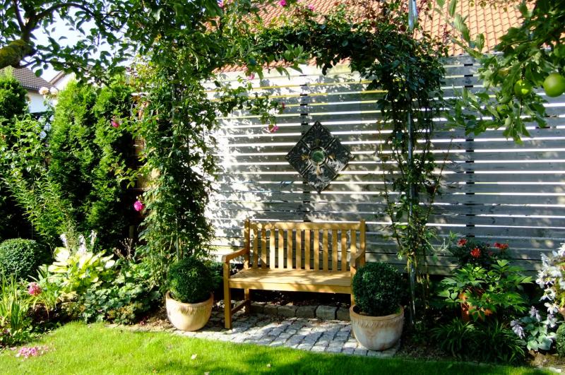 Wir hatten auch die Notwendigkeit, einen Sichtschutz zu bauen, nachdem der Nachbar 1 m höher baute und direkt an der Grenze einen viel befahrenen Weg zum Hauseingang anlegte.Nachdem wir auch in die Zukunft gedacht haben, wir werden nicht jünger, war eine Hecke nicht wünschenswert.So ist es eine Sichtschutzwand aus sibirischer Lärche, die nicht gestrichen wird, geworden.An einem Nachmittag hat mein Mann mit den Jungs die Pfosten gesetzt und einem weiteren Nachmittag die Bretter angeschraubt.Das Ganze steht seit ca. 8 Jahren und weist bisher keinerlei Schäden auf. Das Holz ist, wie gewünscht, grau geworden und ergibt einen dezenten Hintergrund.