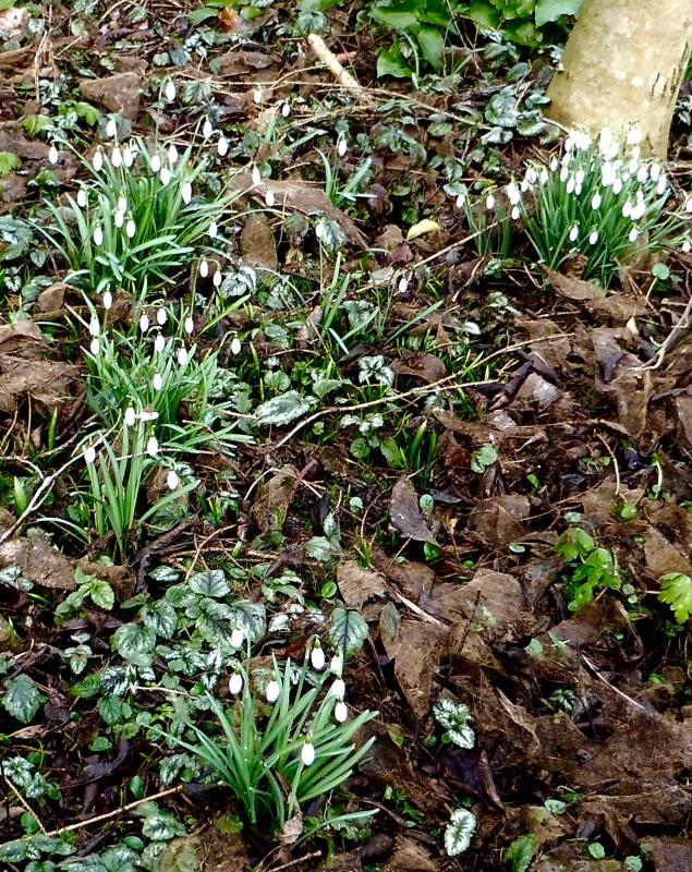 Selbstaussäende Galanthus (einzelnstehende Pflanzen, keine Gruppen, auch Sämlinge sichtbar):