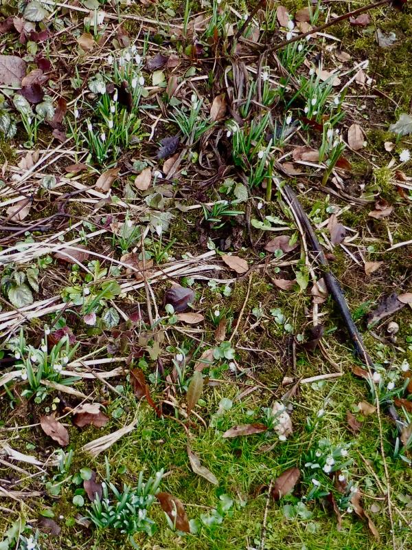 Selbstaussäende Galanthus (einzelnstehende Pflanzen, keine Gruppen, auch Sämlinge sichtbar):