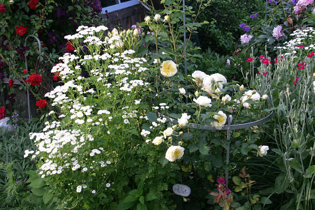 Meine allerbeste Austin schon viele Jahre lang unter echt englischen Bedingungen (Zentral-Schleswig-Holstein): Winchester Cathedral. Blüht fast immer als erste im Garten, dann macht sie einen Schub nach dem anderen. Habe sie schon mehrfach erfolgreich Stecklingsvermehrt. Mit einem nicht zu zimperlichen Frühjahrsschnitt bildet sie einen schönen Strauch, wirkt niemals gakelig. Und das beste: Blüten absolut regenfest. Meine einzige weiße Rose ohne Matsch und Mumien, auch dann, wenns im Sommer mal wieder 3 Wochen am Stück regnet. Ihr bisschen Sternrußtau vergebe ich ihr und scheint sie auch nicht zu stören. Hat bisher jeden Winter ungeschützt (ich häufel nicht mal an) ohne Schäden überlebt, selbst den ganz schlimmen 2013, als wir nachts minus 20 Grad und tagsüber ne ganze Weile minus 15 hatten. Sie steht zudem in meinem sonnigsten Beet, aber das macht ihr garnix aus, auch bei Kahlfrost nicht.Da die Winchester Cathedral von der Mary Rose abstammt, die ich selbst nicht habe, denke ich, die ist ebenso gut - nur in rosa statt weiß. Die anderen, die zumindest auch noch leben, aber in der Gesamtwirkung nie an sie heran reichen können, sind Munstead Wood, Crocus Rose (Emanuel), Eglantyne und Queen of Sweden. Allerdings habe ich die auch noch nicht so lange wie die Cathedral, und gerade von der Queen of Sweden habe ich im hiesigen Rosarium und in einem Privatgarten zwei umwerfende Exemplare gesehen. Wäre die anfällig, hätte die sich niemals so riesig entwickeln können. Von ihr erhoffe ich mir noch einiges!