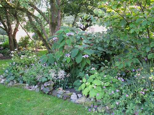 Ruft mich da jemand? ;DMöglichkeiten gibt es da viele...Wenn es nicht rosa sein soll und wirklich einigermaßen schattig ist, dann wäre bei mir Hydrangea aspera 'Macrophylla' die erste Wahl. Leider leidet das schöne große Laub bei zu viel Sonneneinstrahlung schnell.