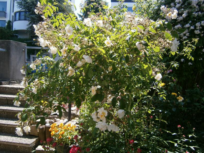 Sternenflor habe ich hier auch im Beet zusammen Salvia Blauhügel. Und ja, Du hast recht es ist auch eine Bodendeckerrose.Die Blüten sind mir für eine Kaskade zu klein, außerdem hat sie bei mir SRT. Deine Kombi mit der grauen Pflanze sieht sehr schön aus, elis! :DNoch eine Stanwell P. (habe eine als Hochstamm und als Strauch) möchte ich nicht haben. Nur wenn es sie in weiß gäbe, denn sie ist einfach perfektSchau mal nach der Sternenflor, sie blüht weiß den ganzen Sommer und duftet. Es ist eine Bodendeckerrose.