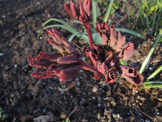 Die P. mairei hängt dieses Jahr total hinterher, gut 14 Tage.Die Triebknospen sind kaum sichtbar. Am weitesten ist P.peregrina.Hier genauso. Dennoch ist die Phäno dieses Jahr ungewöhnlich, denn normalerweise sind die Rockiis um diese Zeit am weitesten. Dieses Jahr ruhen die noch, währen etwa P. ludlowii und einige staudige Zentralasiaten schon munter austreiben. Das Astgerüst von P. ludlowii scheint den Winter wieder einmal überlebt zu haben, heißt: es gibt neuerlich Blüten und danach übermannshohe tropisch anmutende Üppigkeit.die mairei ist immer so bald und sie ist bei mir noch nie erfroren