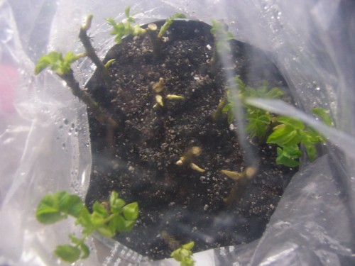 Nun bin ich endgültig zu dem Schluss gekommen, dass das Händchen für Stecklinge wohl bei jedem verschiedener Art und Weise ist. Bei mir verendet mit schöner Regelmäßigkeit jedes in einer Tüte verpackte Steckholz. Die im Freiland gesteckten und mit einem Weckglas geschützten aber strotzen nur so vor Kraft jeden Moment loslegen zu wollen.