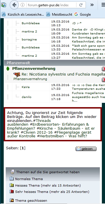 also ich muss da runterscrollen, denn leider werden ja diverse unterforen in den neuen neuen posts jetzt erst nach den gartenmenschen angezeigt. na egal, wenn ihr dickfettrote infoblöcke mit ungeliebten signalworten problemlos ausblenden könnt: gut für euch, ich finde sowas extrem störend.