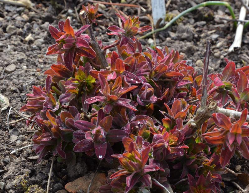 So sieht der Austrieb von Euphorbia polychroma Purpurea heute hier aus.Die beginnende Blüte ist schon zu erahnen.