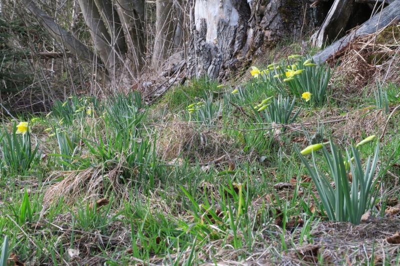 Hier öffnet 'Elka' auch ihre Blüten einige Tage eher als 'W.P. Milner'. Im März-Faden hatte ich sie schon gezeigt.Schon seit knapp 3 Wochen blüht die sehr robuste und vermehrungsfreudige 'Jetfire'. Die zunächst gelbe Trompete färbt sich nach einiger Zeit zu einem leuchtenden Orange, was hier leider nicht so richtig ins Farbkonzept passt. Zum Verwildern eignet sie sich hervorragend.