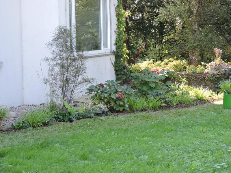 Es wird aber es wird schon noch ein bisschen dauern (werde noch verschieben müssen da und dort, die grosse Hosta wurde schon rausgenommen, ist wahrscheinlich Sum and Substance, und wäre dort auf Dauer zu gross geworden.)Neben den weiter oben schon genannten ist noch die Wachsglockenblume (Kirengeshoma palmata) hier eingezogen, nach dreimal verpflanzen hat sie jetzt wohl endlich ihren definitiven Platz gefunden. Dazu noch Geum und eine rotblühende Astilbe. Luzula Wintergold ist jetzt grün, die Hortensien übernehmen farblich.Den grossen Teil dieses Beet hatte ich in einer Hauruckaktion im Frühling umgestochen. Würde ich nie mehr machen! Obwohl ich recht tief umgegraben hatte, tauchten Fingerkraut und kriechender Hahnenfuss immer wieder auf. In einem anderen Gartenteil hatte ich Ende Dezember umgegraben mit viel weniger Unkrautaufkommen. Ich habe meine Lektion gelernt und Beharrlichkeit dazu was Jäten und Mulchen angeht... ::)Zwei Bilder aus dem Spätfrühling: