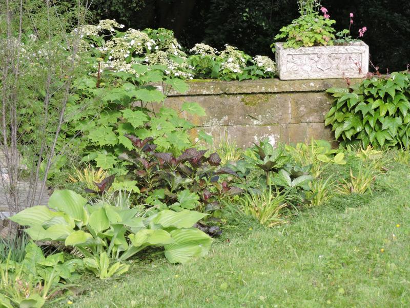 Zweite "Lieblingsecke" mit Hortensie `Preziosa`, Filigranfarn `Plumosum Densum`, Luzula sylvatica, Plattährengras (re)/Chasmanthium latifolium