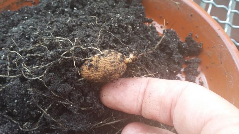 Dabei kam die Knolle zum Vorschein. Mit den Zuwachs dieses größten Sämlings (gekeimt Januar 2016) bin ich ganz zufrieden!