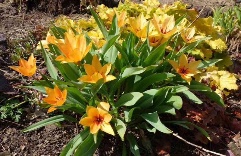 Die T. kaufmanniana Hybriden sind alle früh dran und ziemlich niedrig. Sehr leuchtend sind beispielsweise Showwinner (hier zwischen Krokussen, also wirklich sehr niedrig) und Scarlet Baby.